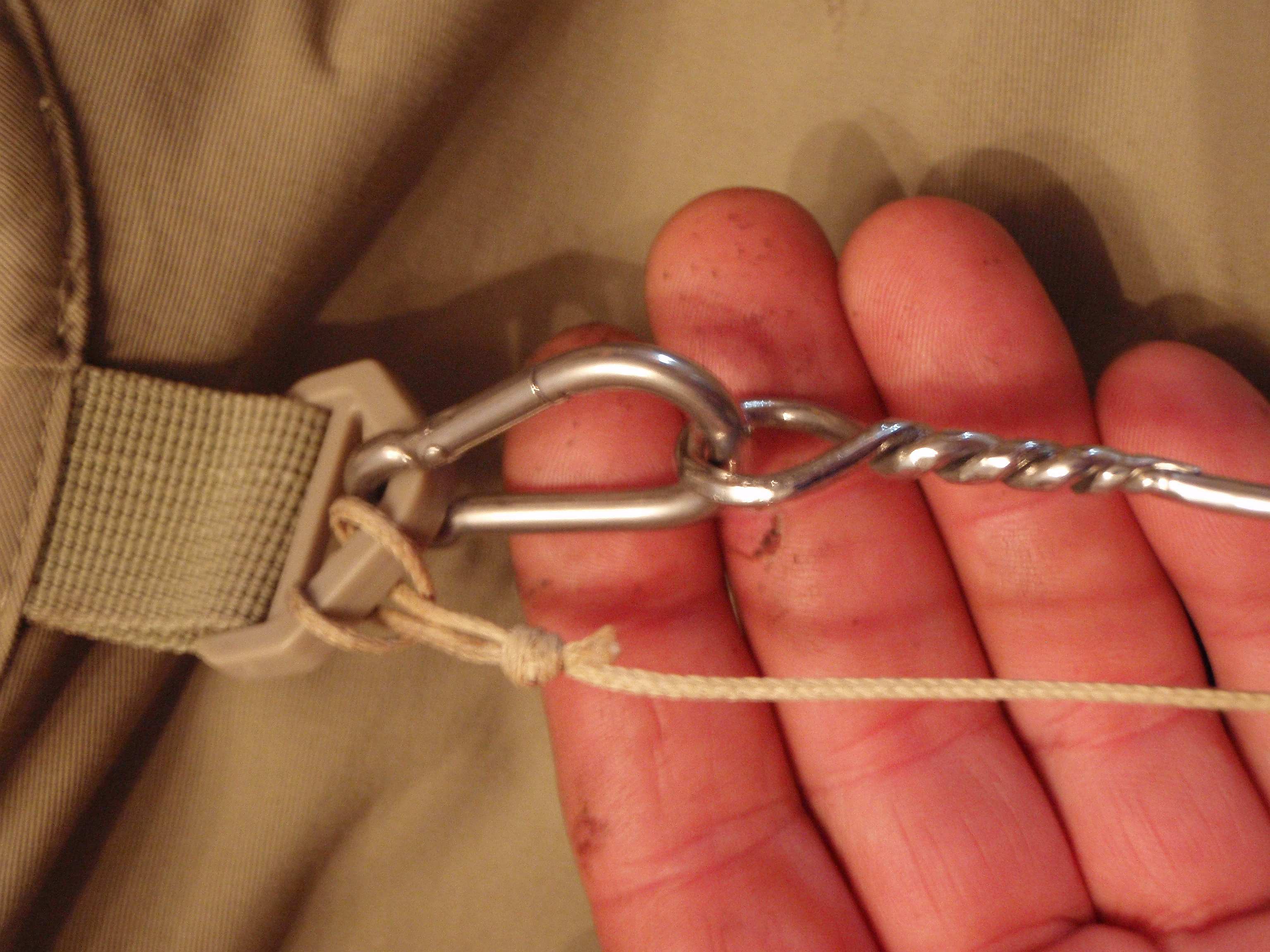 Mul sarnane puupulgaga kunagi olnud, nüüd ühel kamraadil nägin traadist, pakun jõhkralt miskist riidepuutraadist vms näpadega tehtud ja ta kasutas kah pisikest karabiini, tundus popp ja noortepärane, affisin kohe järgi, tegin täpselt nii suure aasa, et saaks vesti tilulilu plastjubina pilust täpselt läbi pista ja jääb pidama, a panin lõpuks ikka karabiini, lihtsam. Pael on 400lbs tõmbega kevlar.