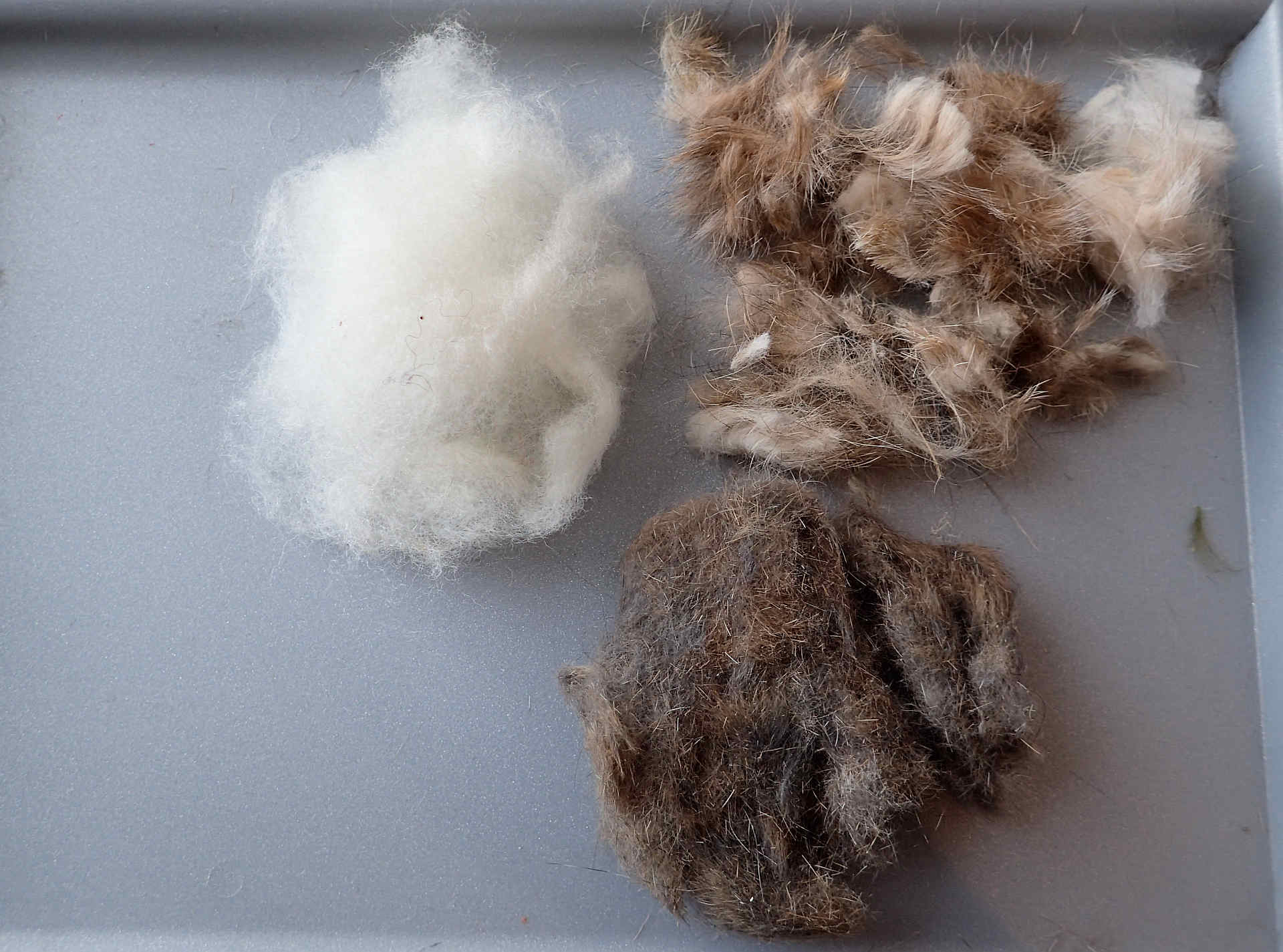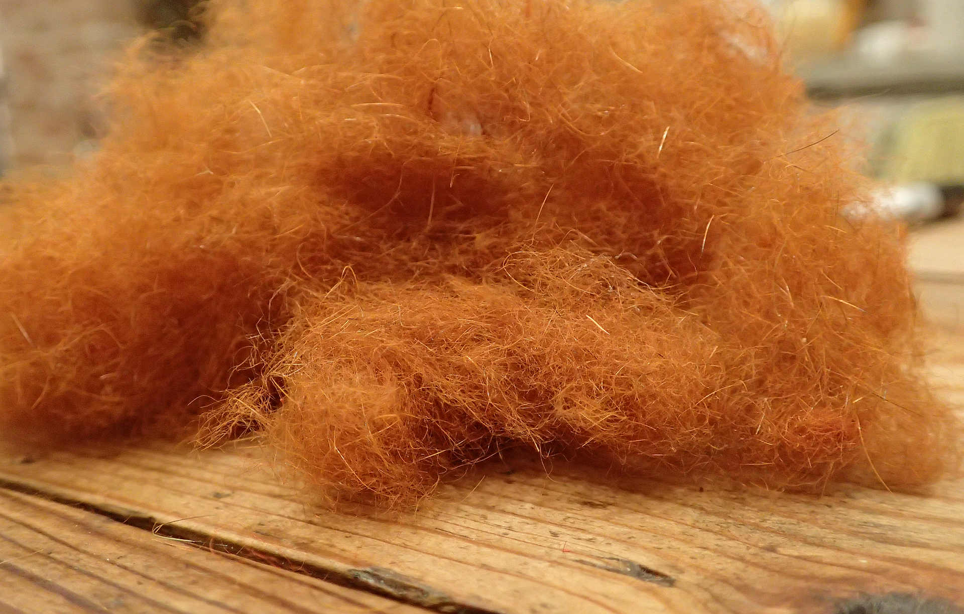 Segasin ja värvisin dubbingut omale, alguses panin umbes võrdsetes osades eesti orav-poe jänesemolu-meriino villa heie. Orava korjas maanteelt tuttav jahimees, rapla kalapoe sügavkülmikust sain kätte, oli kenasti ühe nugise kõrval, kelle sabatipp on eelmisel lehel tulemasina kõrval, meriinot ja muid lambaheiesi erinevaid heledaid sain viltijatüdruku käest. Segasin alguses näpuvahel ja pärast kohviveskiga ja siis läksin sidusin ühe nymfikere ja harjasin lahti oli peaaegu hea aga see ei rahuldanud ja panin natuke jänest juurde. Ja värvisin kolmeks nutsakuks - insect green+chatreuse, ginger ja fluoro oranz. No ja sama hooga püüd ka