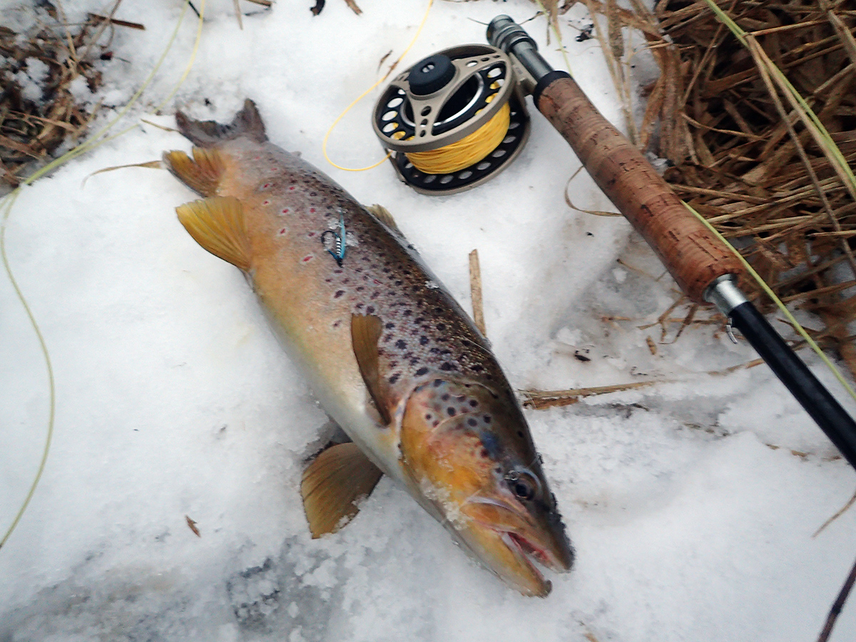 Sai siis ka hooaeg avatud (01.02.) nagu kord ja kohus. Tõusin hommikul viiest ja vaatasin kraadi, näitas 0, seega kiire meil, et tööle ei jõua ja tee termosesse ja minek, sest püügikohta oli hea 2h sõitu. Kui Tallinnas maa must ja vesi lahti, siis tee peal hakkas vahepeal näitama paari miinuskraadi ja lumesadu tihenes nii kõvaks, et eesliikuvat autot oli raske märgata, mis tõttu langes kiirus maanteel 70ne juurde. Pärast paari tundi sõitu kõikvõimalikes ilmades (lumi, lörts, vihm, päike ja kõik muu mis vahepeale mahub) sain tiigi äärde kohale. Rõõmuga sai tõdeda, et jääst polnud kuskil haisugi ja ilm oli ka peaaegu mõistlikuks suutnud pöörata. Panin kaika kokku ja kahlad jalga ning püük võis alata. Esimese kahe heitega oli kohe kalad taga, kuid kaldale ei õnnestunud kumbagi saada, juu värises käsi veel suurest erutusest. Sain natu jalutatud ja uuesti püüdma hakatud ning uues kohas esimese viskega kala taga ja kena põrsas ka (L-48; 1,275kg). Sellega oli pm 10ne minutiga päeva juba korda läinud ning edasi lubasin uusi putukaid proovida. Tulemuseks oli veel 3-4 kala kes ületasid julgelt 40cm piiri ning terve posu veel mõõdukalu. Tavapärased "kilkarid" kes selles kohas kummitavad, ei tundnud huvi tundvat sel päeval ja kui aus olla siis väga ei olnud põhjust ka kurta. Vastu õhtut kala võtt rahunes ning seadsin suuna kodupoole hinges rahu.