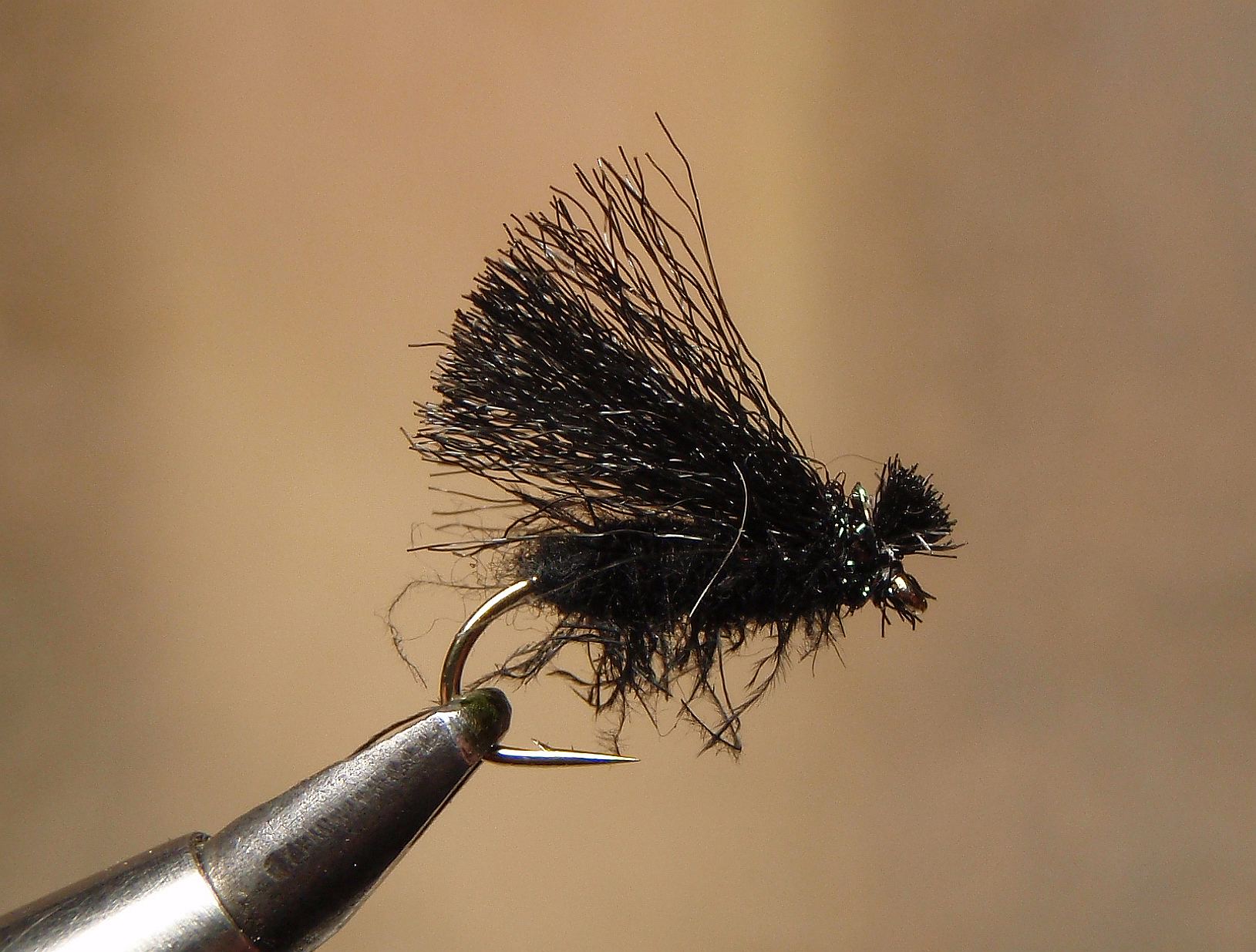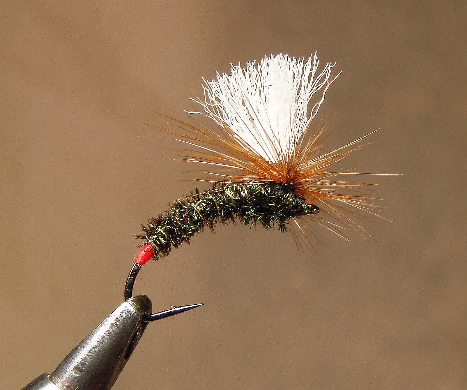 Sellel dun värvi caddisel on seesama polüpro tiiva peal , mis eurooplasel tiiva all. Keskele kinnitamine ... eks see harjutamise asi ole jah . Suurim viga on see , et keha seotakse liiga pikk ja siis on vaja tiib siduda keha peale . Kuni tiiva kinnitamiseni peab putuka pea koht olema haljas konks, tiiva kinnitad haljale konksule ja edasi hakkad pead (vajadusel häklit ) aretama. See jutt kehtib kõikide putukate puhul . Seo striimereid või lõheputukaid , mis iganes , putuka pea koht kuni tiiva kinnitamiseni on haljas konks.