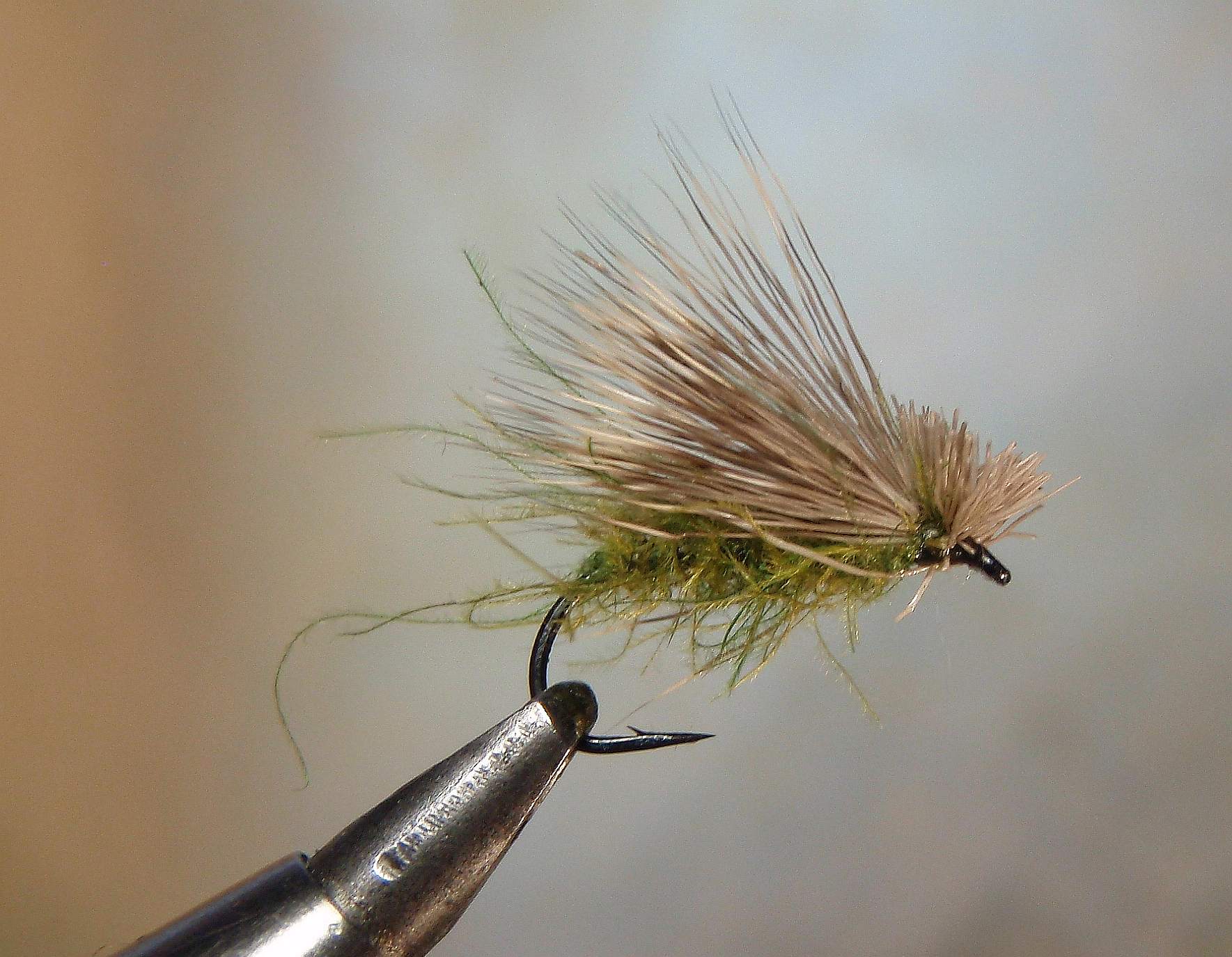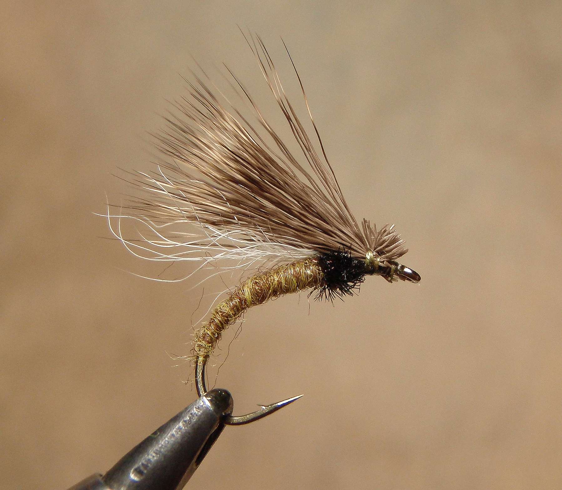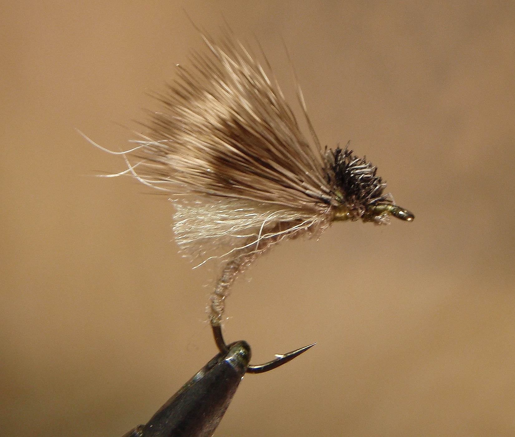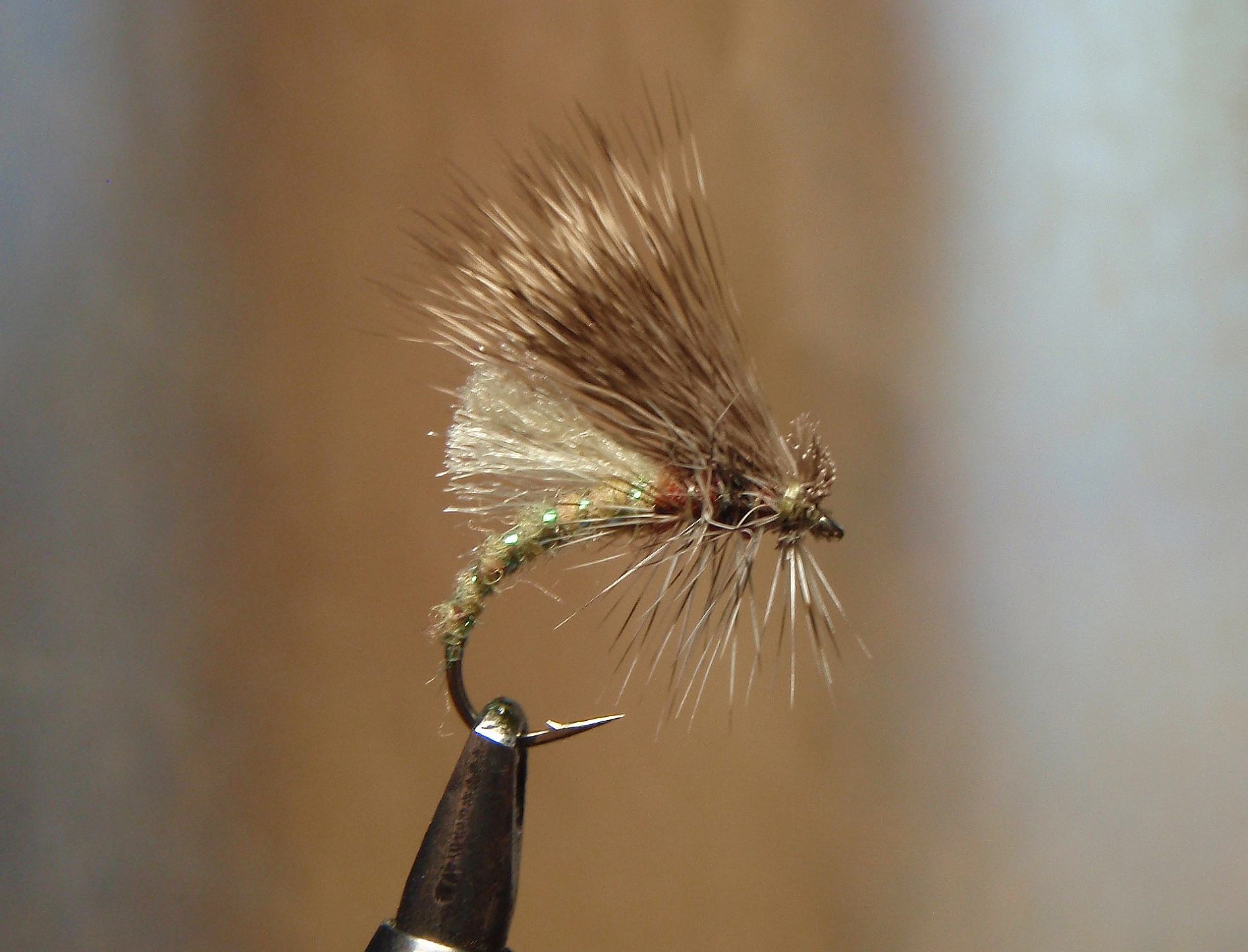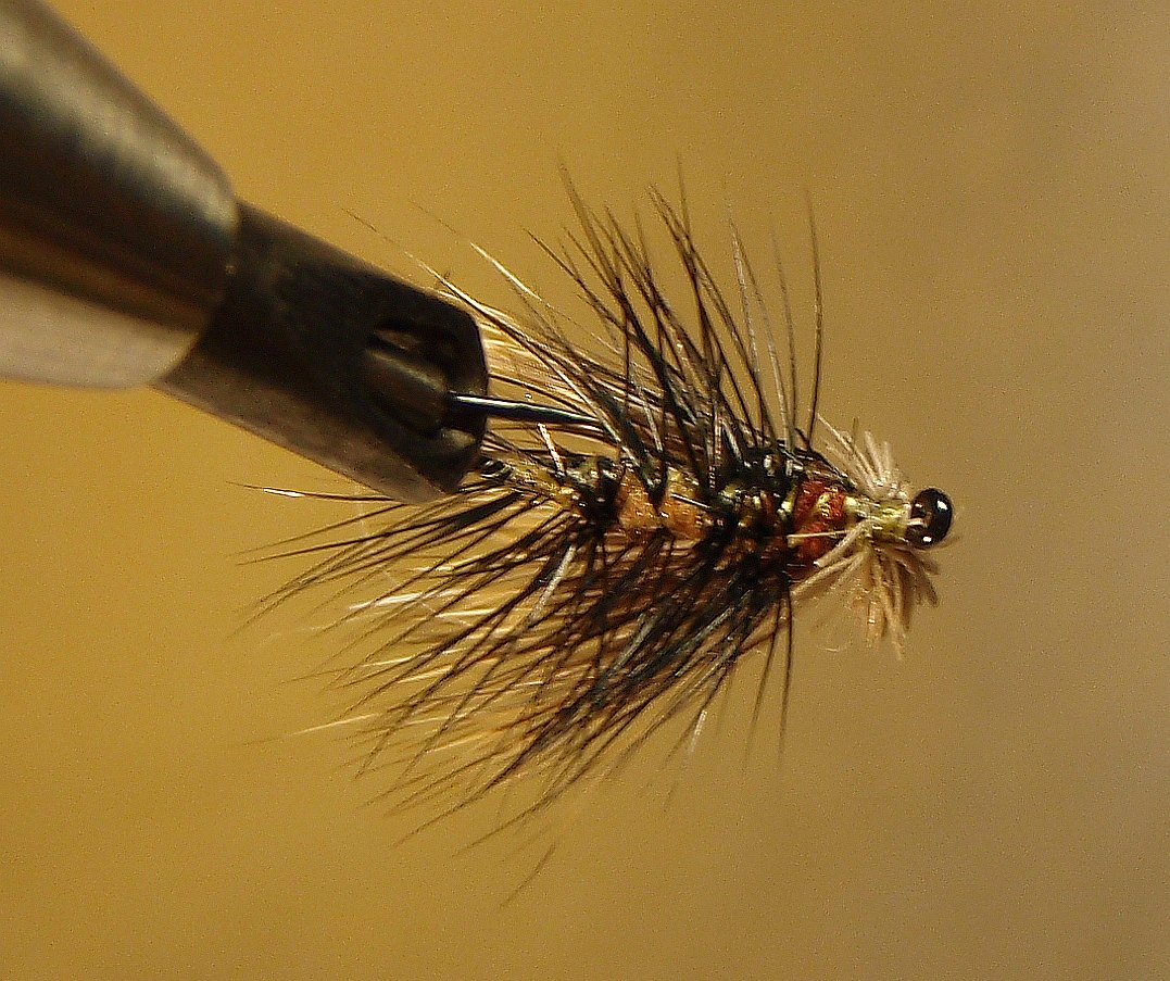 Laias laastus niidiga üle konksu, sulg konksu silma juures nii kinni, et suleroots vahib kida koole, sulg konksusilmast eemale, siis dubbingutega konksu kaare poole, niit jääb sinna rippu, siis sulega parajalt spiraalselt konksu kaare poole, siis niidiga üle hackli tagasi, siis topeltseasõrg, et püsiks paigal, siis altpoolt sektor välja kääridega hacklel, siis hirv peale ja natuke rullin jaotumist, et madalam saaks, läheks ka külje peale.