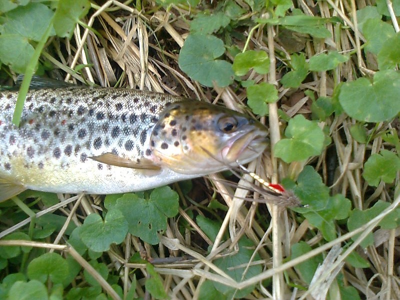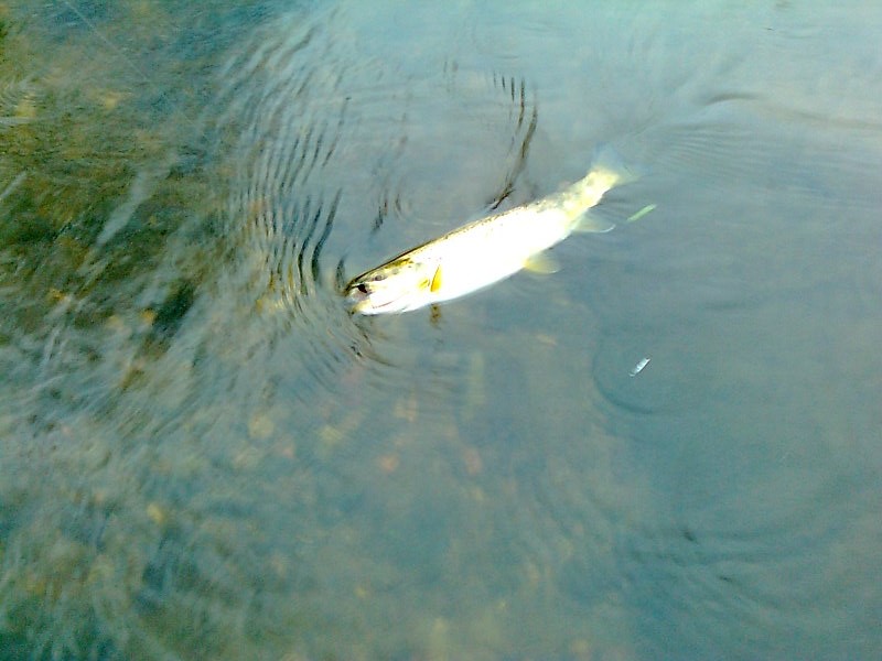 . Heide, natuke voolus mängimist ja....kinni. Hmm, okei. Tegin ridvaga paar kiiremat liigutust, ehk tuleb lahti. Ei tulnud. Tõmbasin siis korra heitenöörist käega ja järsku tuli üks tõmme vastu. Võtsin ruttu maast ridva ja kerisin nööri sisse. Vastas kaldas jälgis üks tonkataja seda kõike pealt, jättis isegi oma püügi pooleli, et mulle kaasa elada. Ligi 20 minutit väsitamist ja kaldal ta oligi. Muidugi tegi vahepeal päris pikki sööste nii üles- kui allavoolu. Lips kõigest 0.17mm ja see oli risti suus. Nii kui kalal käe taha sain, läks lips pooleks. Kalal kaalu 3.6kg. Ilmselt mingi algaja õnn