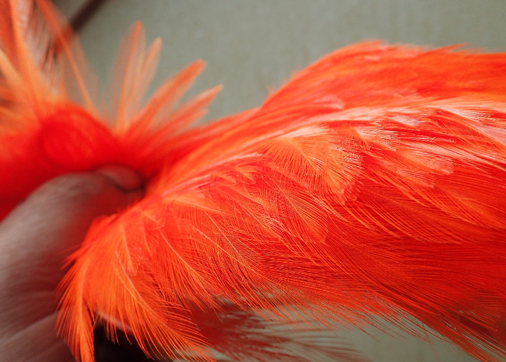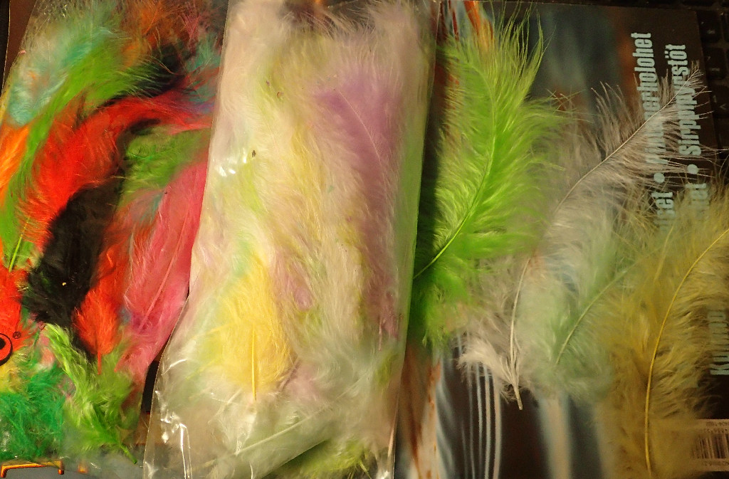 Ükspäev käisin miskit kontoritarvetes ostmas, jäi silma sulevärki seal nurgas a la tee midagi ise, dekoreeri. Osad pakid mingit kukekeresulge oli sulaselge pask sidumise koha pealt, fiibrid värvist rasked ja koos, selle eest marabou pakid väga ilusa sulega, pikad ühtlased, väga hea fiiber, euriümber oli pakk. Kärtsmürtsu harva vaja, pastelli olen juba sidunud.