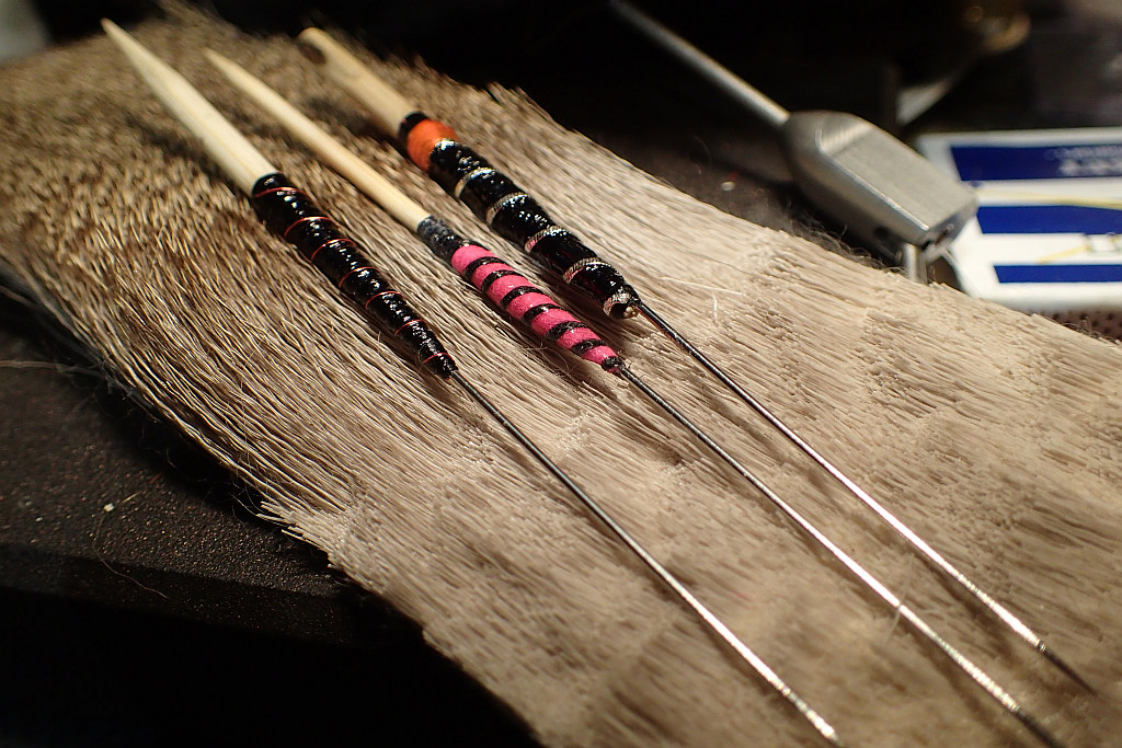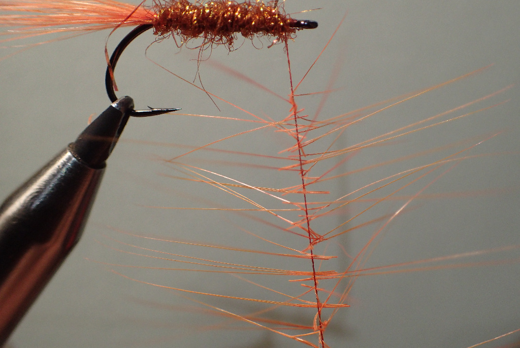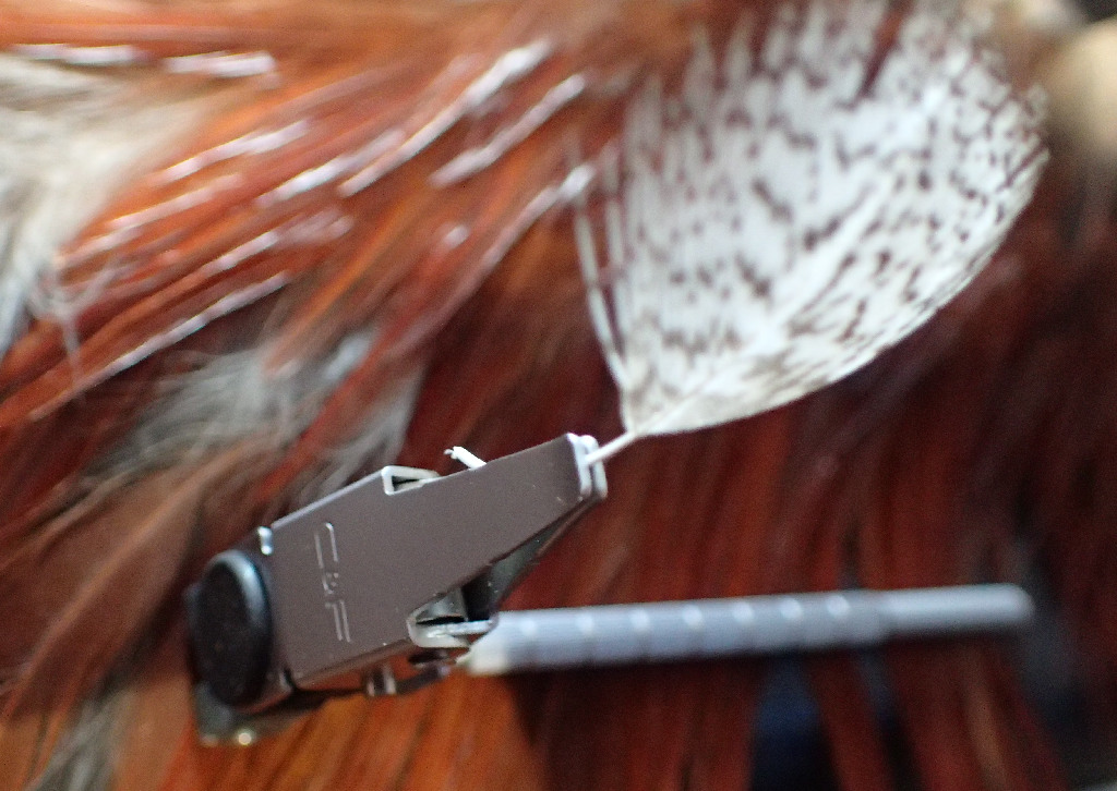 loomulikult ja kui materjal on ebasobiva pikkusega, siis saab samuti skeemitada, mitte alati aga peaaegu alati. Kui edehackliks sobiva värviga sulg on õnnetult pehme aga sobiva pikkusega, siis dubbingukuul edehakli taha toetama. Fiibrit saab näpuvahelt ka panna edehackliks nagu bucktaili, paned pundi ära näpuvahelt, niidikeerd ümber, siis jagad rahulikult ringiratast ära, pingutad, vaatad, kui rahul pole, siis lased lõdvemaks ja jagad paremini. No ja siis muidugi dubbinguloopiga panek või niidi poolitamine, mul küll vaja polnud aga jutujätkuks võtsin sellesamast eespool jutuks olnud hotoranz haugipoolepealt sule ja sealt siis fiibrid ja poolitatud niiti ja on täpselt samamoodi aksent lisatud, käe pealt pildistatud, veits udune aga aru saab.