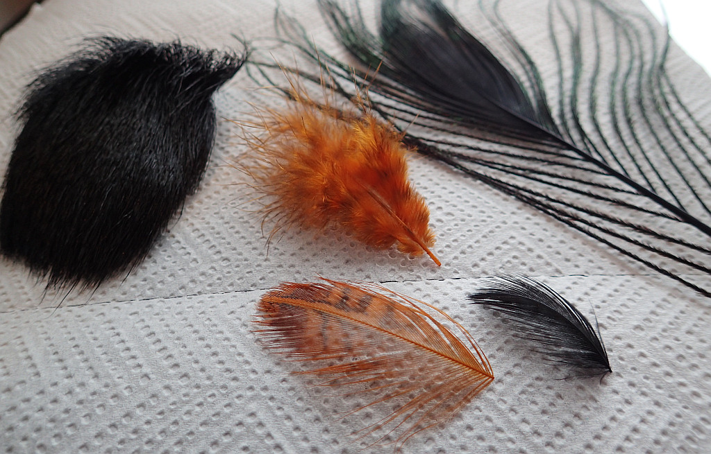 Tegin esimese värvimiskatsetuse, ostsin veniardi värve väikse valiku, puhastusaine ja sulepildil on t.h. käest saadud naturaalne hirv/mustaks, hall naturaalne grizly marabou/ginger, püü keresulg/must/ginger ja paabu/must. Mul mingid konkreetsed vajadused ja soovid, et mida tahaks ise värvida, see esimene värvimine esimene samm, et ära proovida, kas jääb, kuidas jääb, milline on märjalt ja milline jääb kuivalt jms.